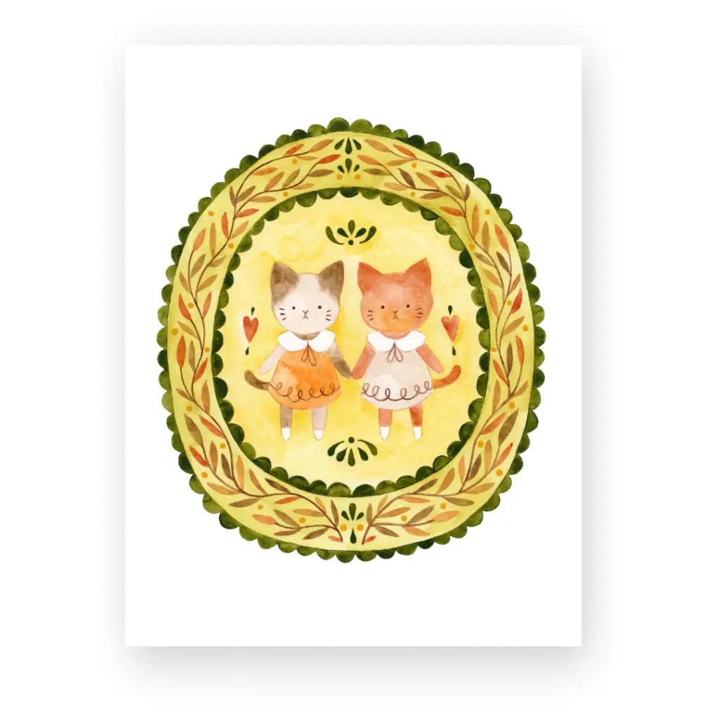 A folk inspired portrait of two kitty sisters.