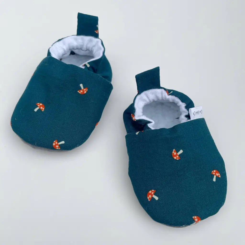 Mini Mushroom baby shoes feature cute red and white mushrooms on a teal blue background. Soft sole baby shoes are ideal for newborns to walkers. Meticulously made and baby tested! Handmade and designed to stay on and keep baby's feet cozy. Made using high quality designer cotton, lined with breathable cotton flannel with plush sherpa insoles.