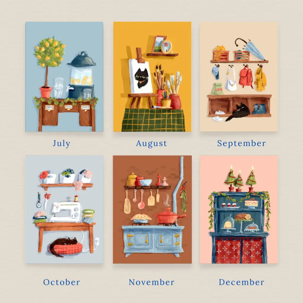 Enjoy 2026 with this cute illustrated wall calendar perfect for small spaces. Each month features an illustration celebrating the nooks and crannies of our home and the things we love to fill it with: hobbies like baking, cooking, coffee and tea, a cozy book nook, house plants and cute cats.