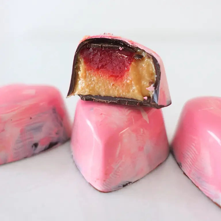 Silky peanut butter Gianduja, and bright raspberry pate de fruit come together inside a 60% dark chocolate shell. The perfect pair wrapped in indulgence.