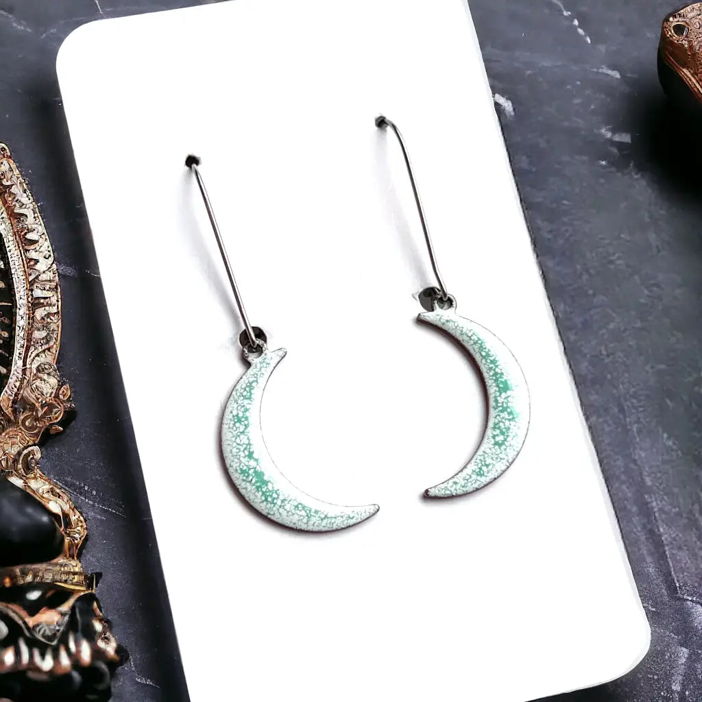 These enameled copper earrings are 1" and they hang on stainless steel kidney wires that hook in the back.