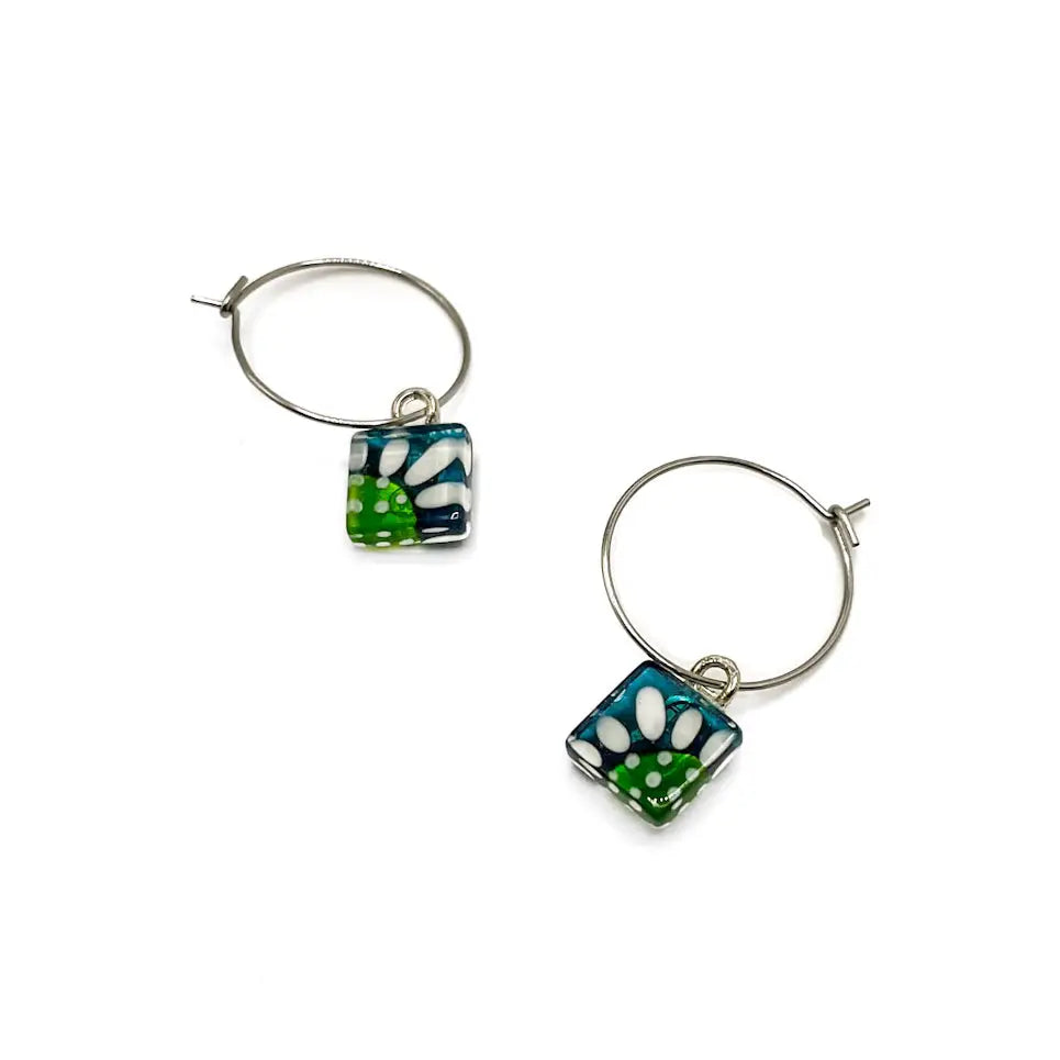Square Green White Daisy on Teal Handpainted Glass Hoop Earrings