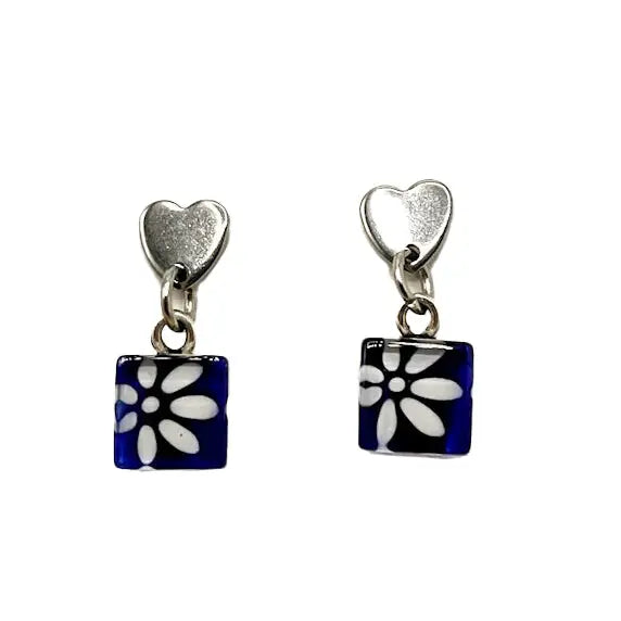 White Daisy Blue Square Handpainted Glass Dangle Heart Earrings