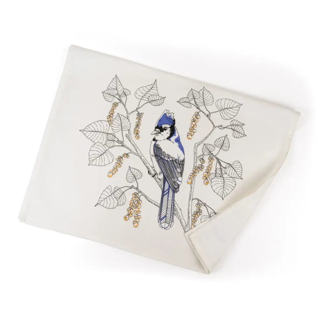 This tea towel showcases an intricately detailed Blue Jay with delicate yellow foliage.