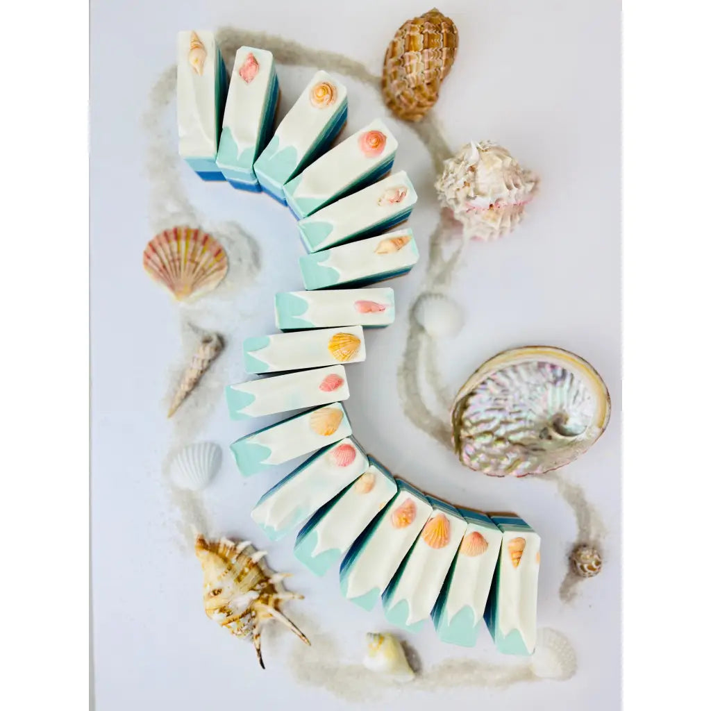 Inspired by Crystal Crescent Beach in Nova Scotia. This luxurious soap bar combines notes of citrus, fresh rain, oakmoss, and sea salt. The result is a captivating blend that evokes the tranquility of the sea and the invigorating breeze of the ocean. The dancing blue waves and delicate seashells on top remind us that we are blessed to live so close to the ocean.