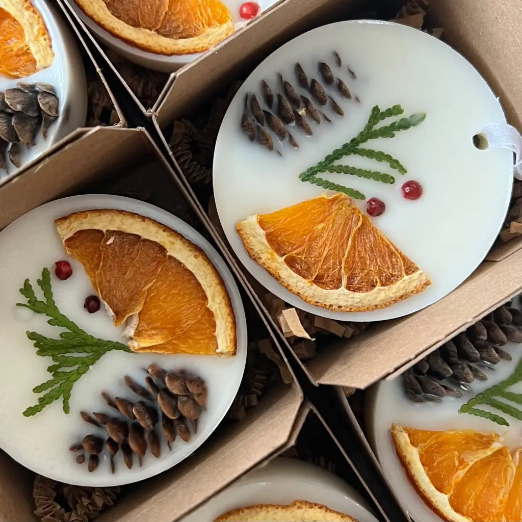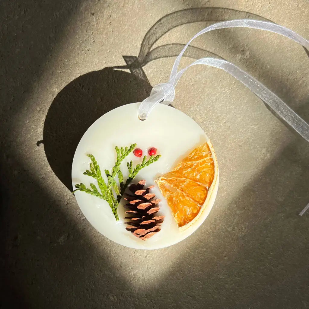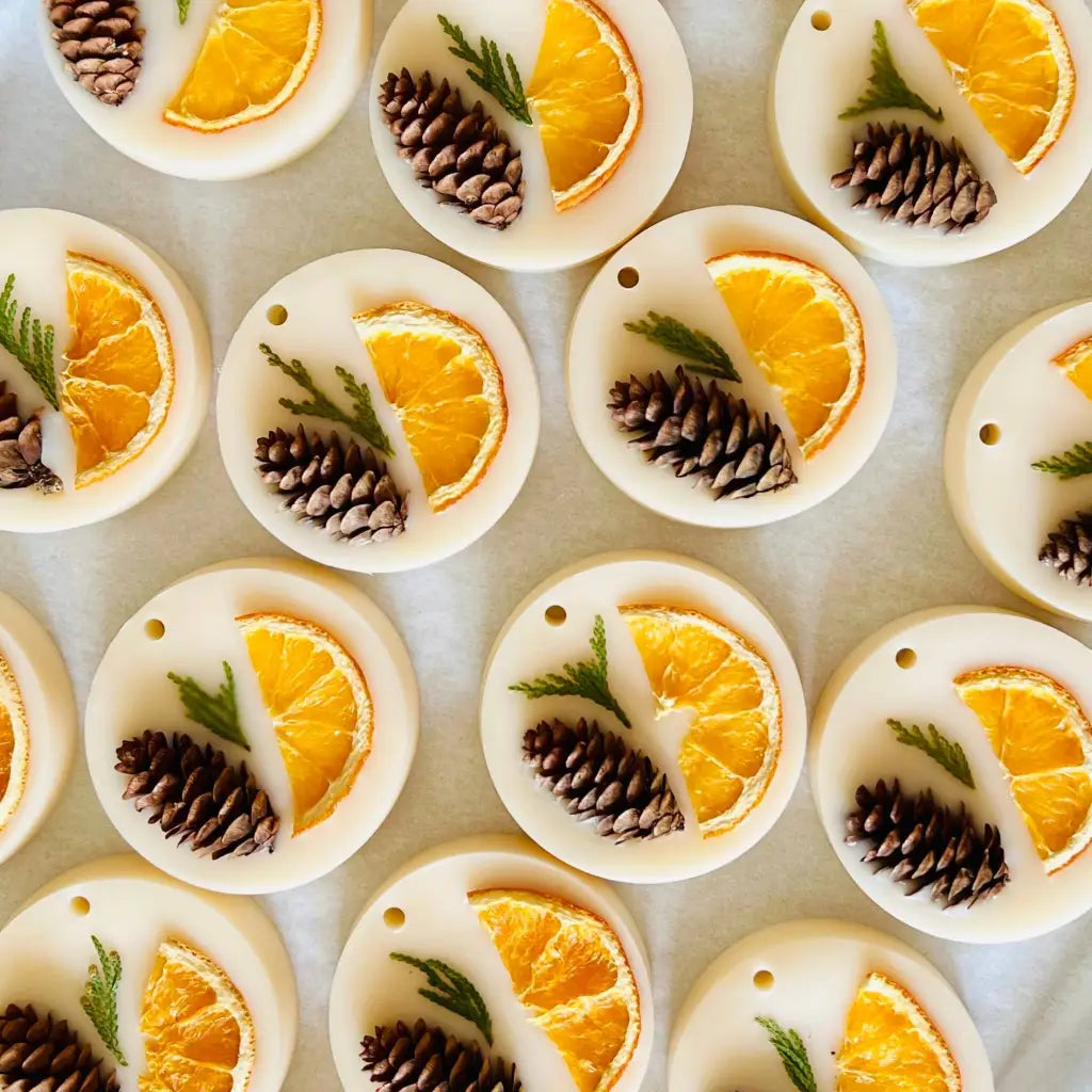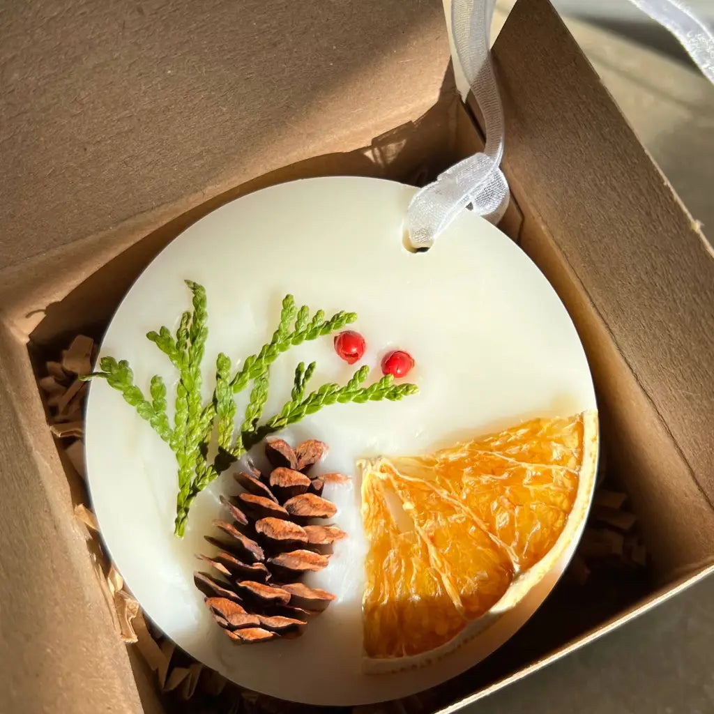Highly scented wax sachet is handcrafted using soy wax, fragrance oil, and botanicals. Add notes of clementine and sage to enhance the Christmas atmosphere.