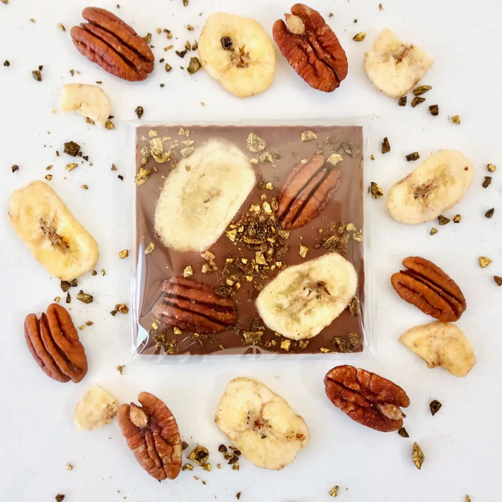 A rich 34% Belgian milk chocolate bar topped with Banana Chips, Pecans and Espresso Beans.