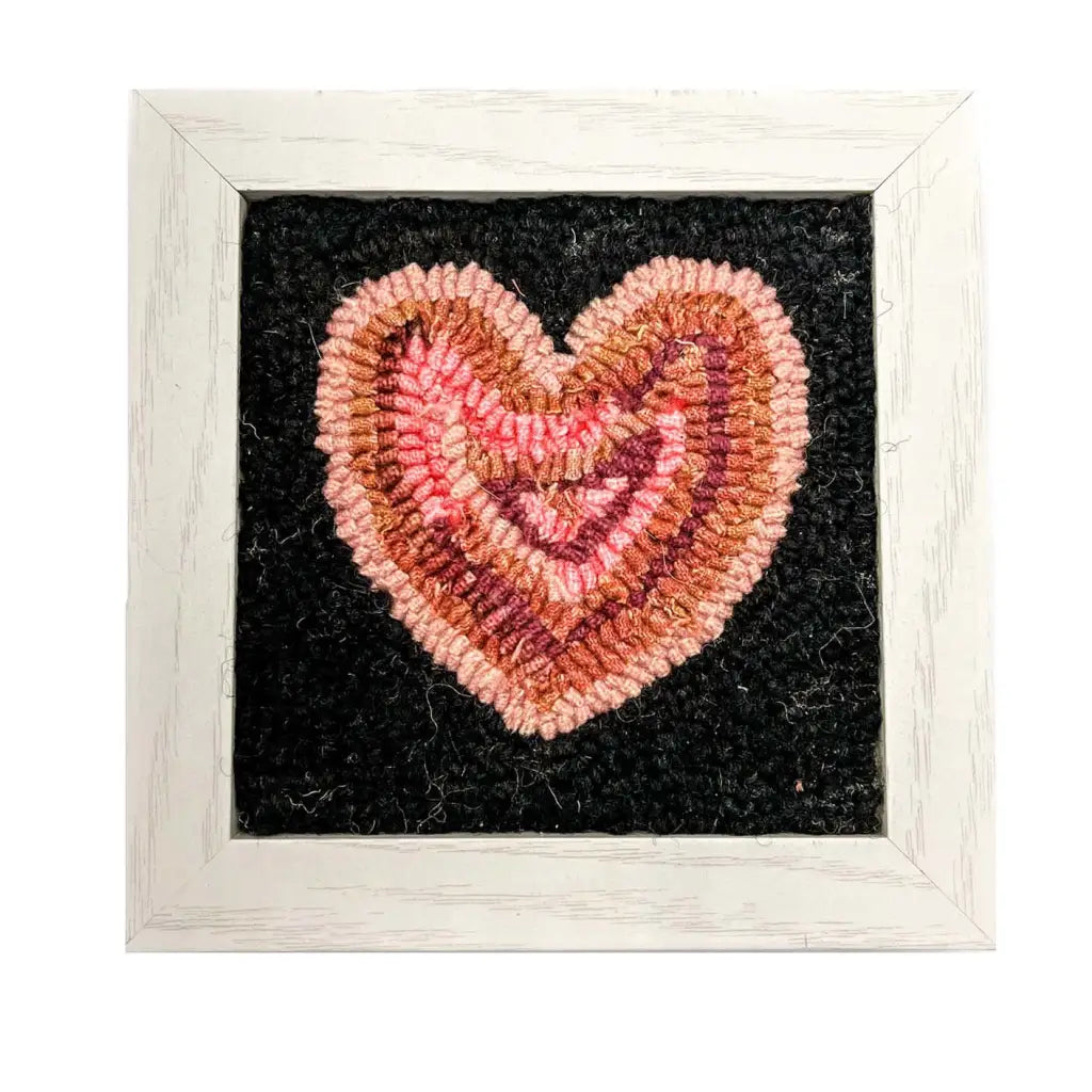 Framed decorative hooked rug wall hanging in the shape of a heart.