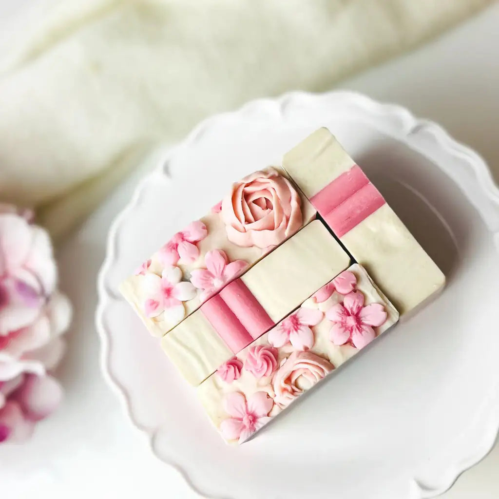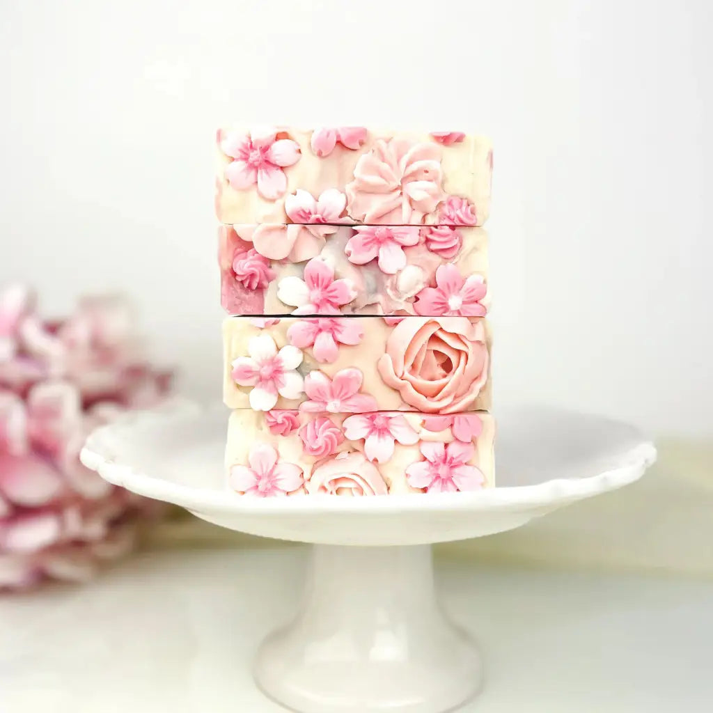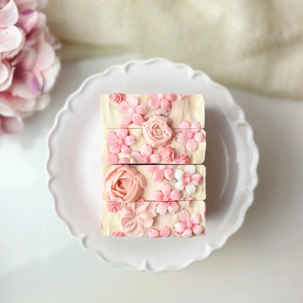 Infused with the sweet and floral notes of hyacinth, gardenia, lilac, and green leaves. This soap will transport you to a garden of blooms with every use. The soap is made with skin-loving oils and butters and vegan ingredients. To add an extra touch of elegance, we've added cherry blossom embeds on top, along with piped soap roses.