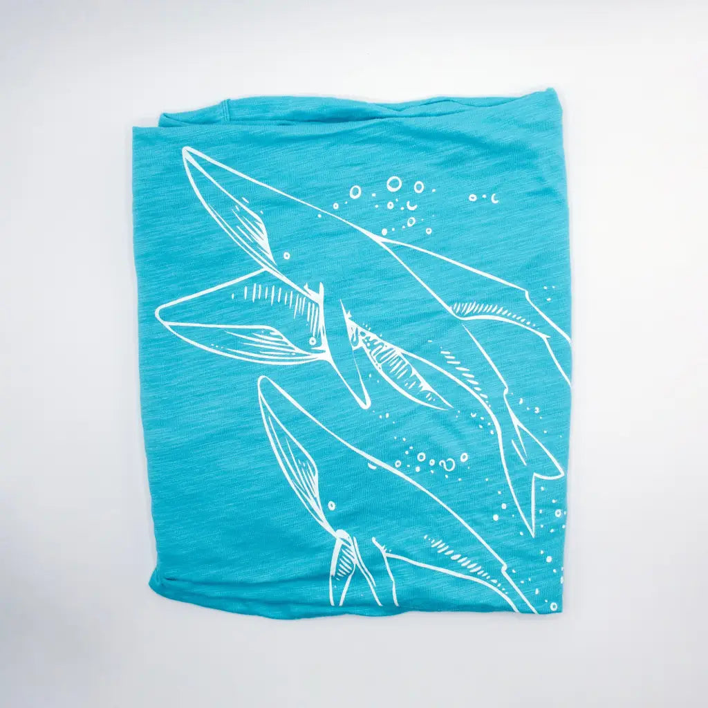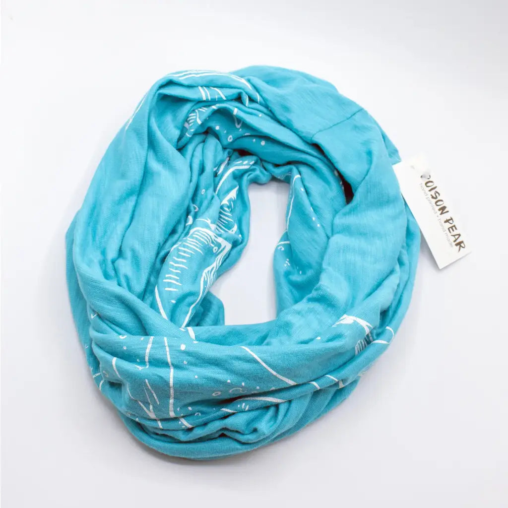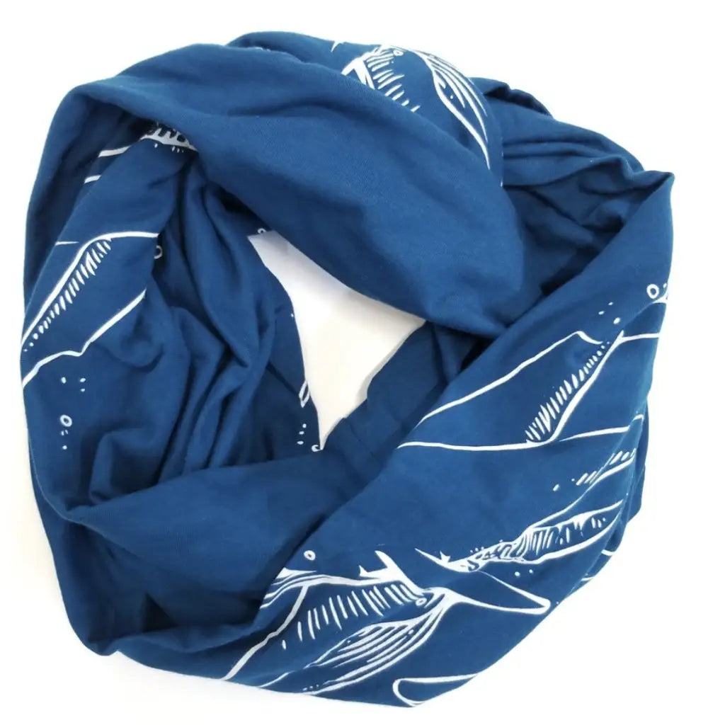 This cute infinity scarf is made out of a super soft ocean blue bamboo-cotton-spandex blend, and hand printed with whales and bubbles in pale grey ink.