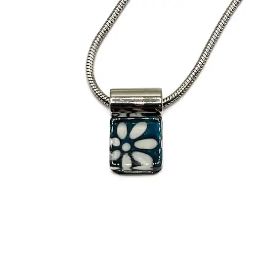 Small Square White Daisy on Teal Handpainted Glass Pendant