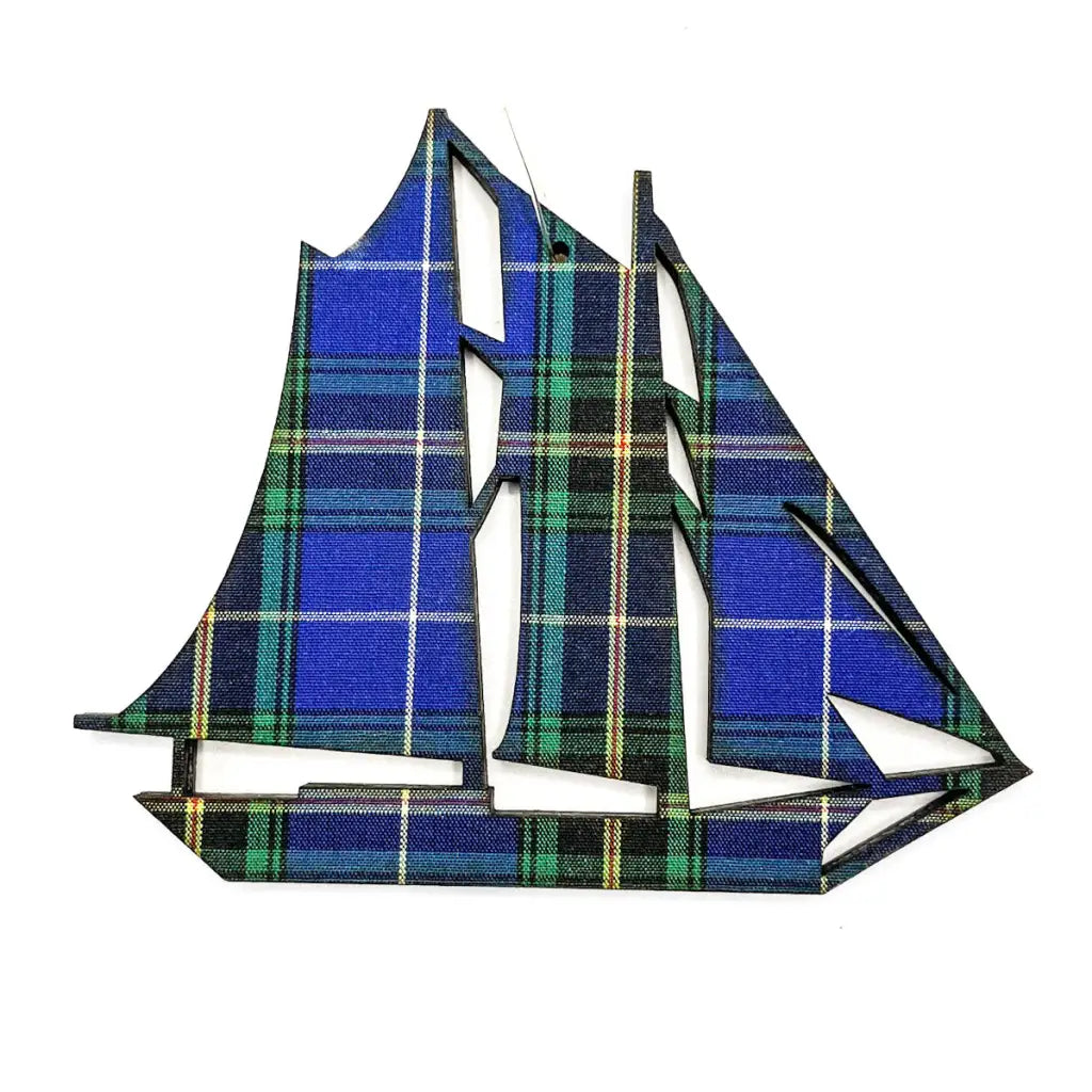 Bluenose ornament made with Nova Scotia tartan fabric.