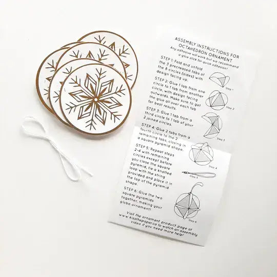 Each kit contains hot foil stamped and die cut 2.25" circles, white cotton string and assembly instructions to assemble your own octahedron (8 circles) globe ornament.