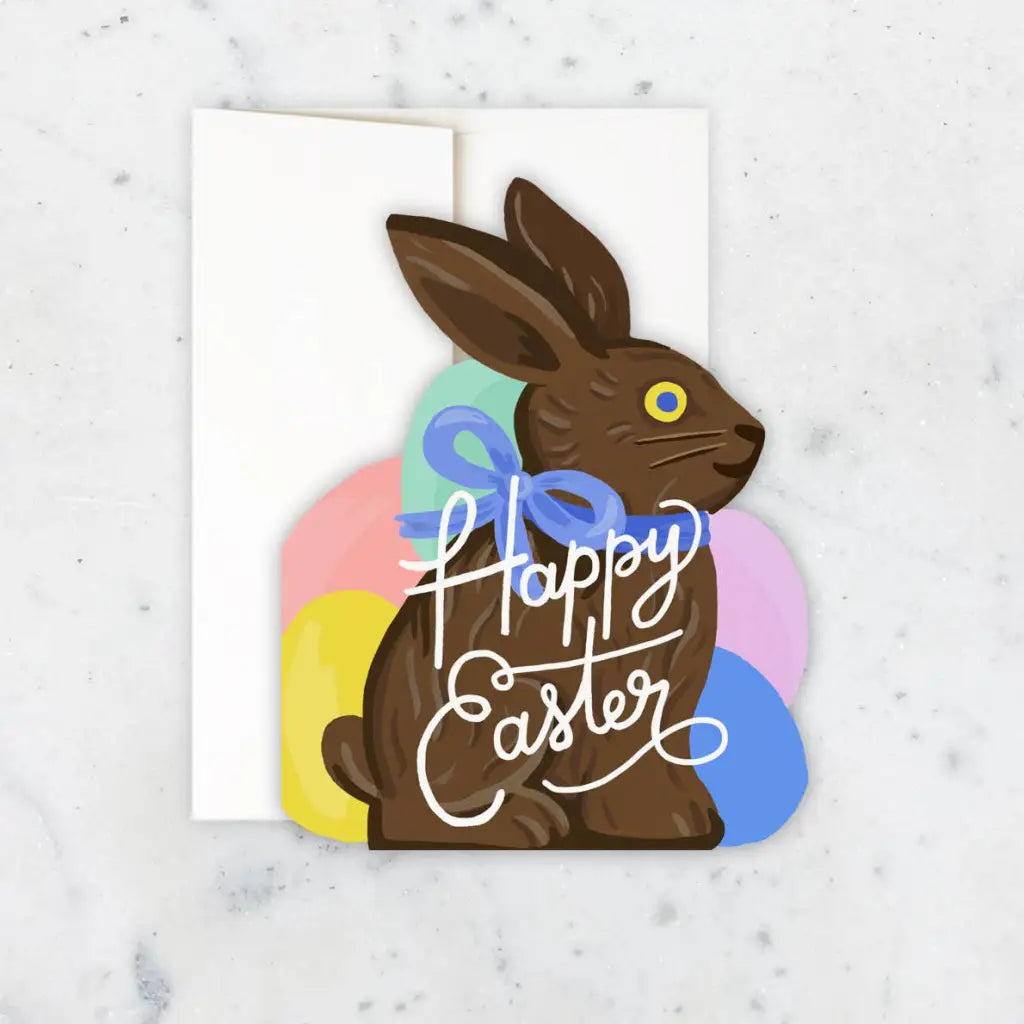 This hand-painted classic chocolate bunny and painted eggs are printed on a folded card die-cut for extra flair!