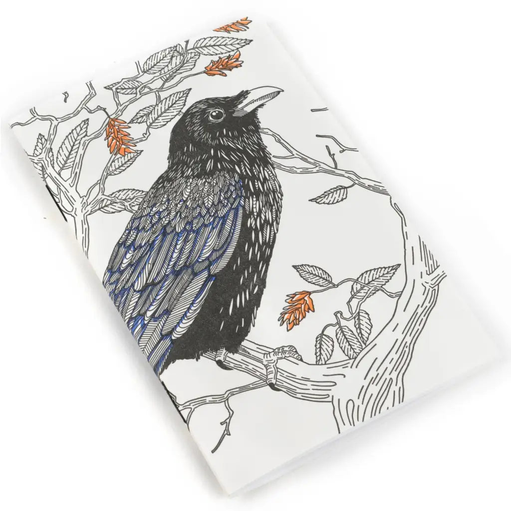 This pocket-sized raven notebook captures the birds beauty through letterpress printed intricate details on a high quality light cream stock.
