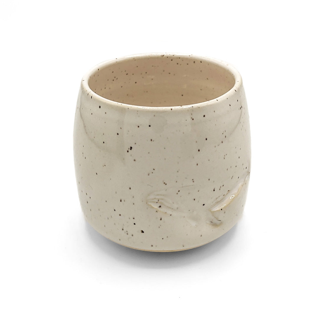 Wheel thrown and dip glazed by hand with one of two imprints.