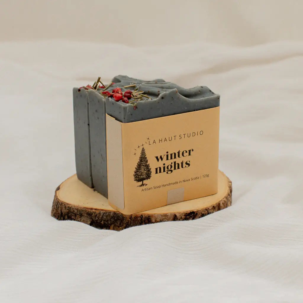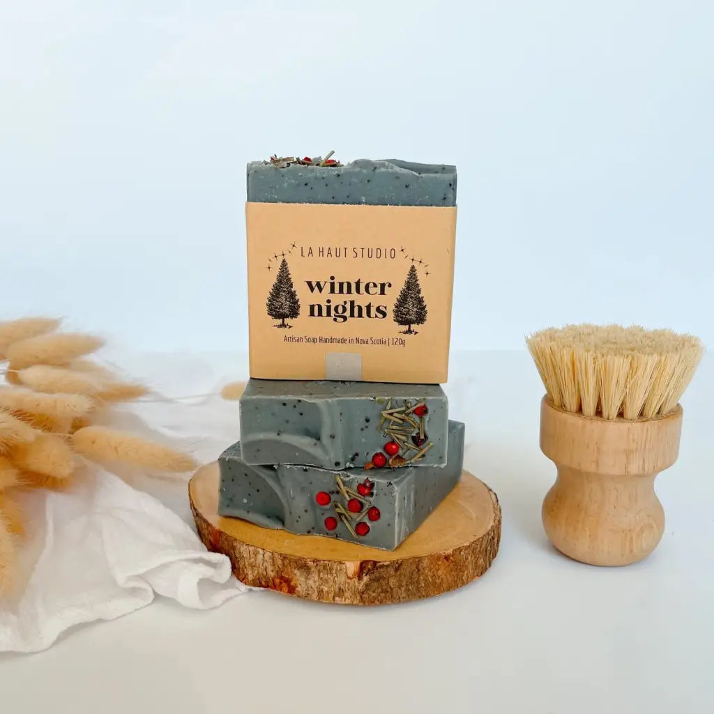 Made with a luxurious blend of patchouli, cardamon, fir, and bergamot essential oils, this bar is woodsy, fresh and spicy. With coffee grounds for a light exfloiant and activated charcoal for a deep clean. Packed with skin loving oils like, olive oil, shea butter, coconut oil and caster oil. Topped with fir needles and pink peppercorns.