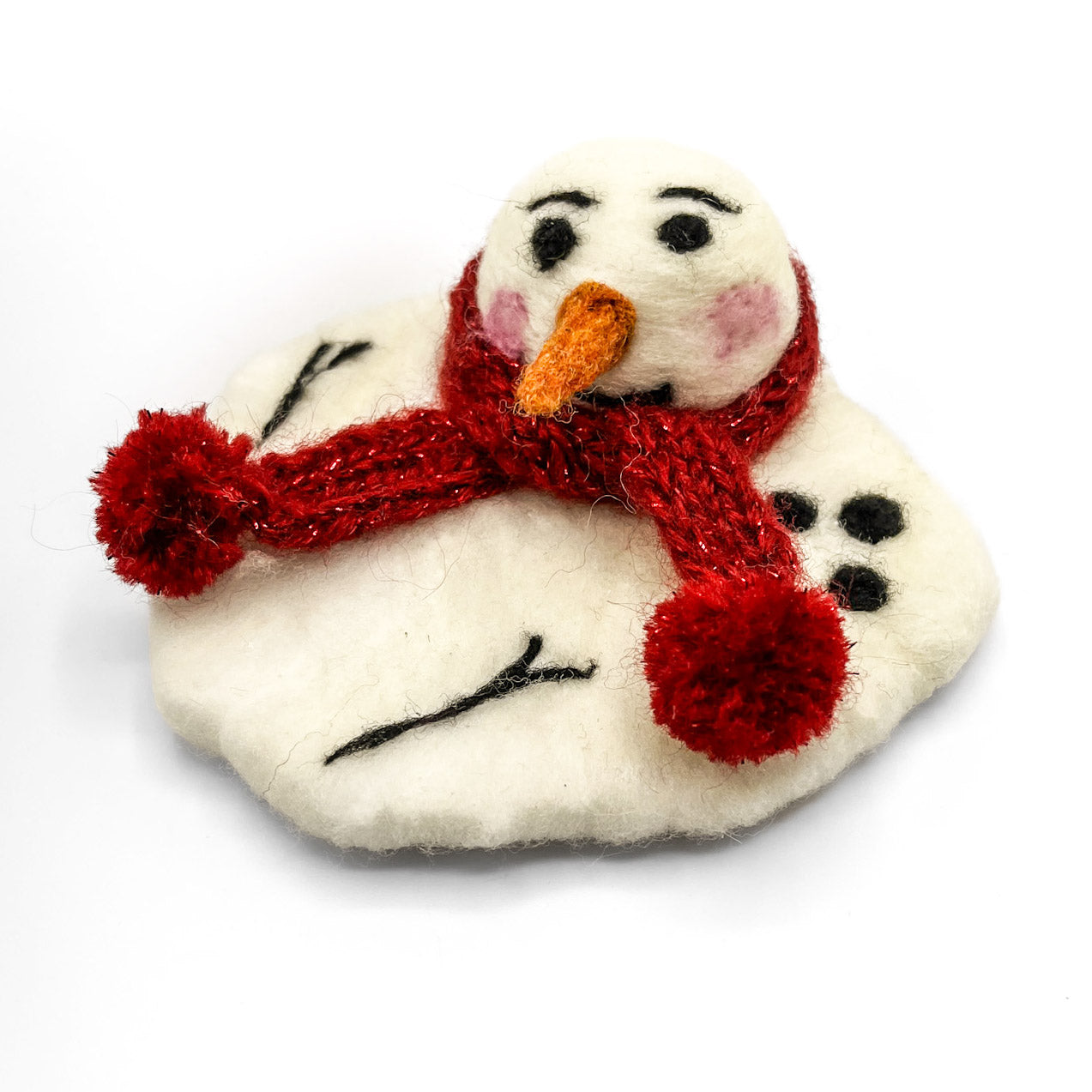 Whimsical felted sculpture of a melting snowman with a shimmery red scarf!