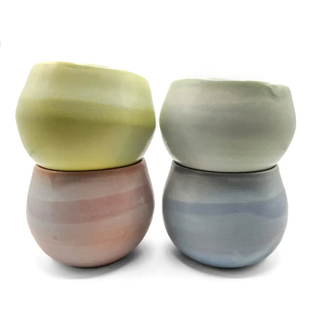 Each bubble tumbler is created to be unique; infused with its own personality. Every bubble is thrown on the potter’s wheel then is altered and built by hand to create wonky variations of big and little bubbles. Layers of coloured glazes are dipped and overlapped for colour fluctuations and textures. Has a satin glaze that is soft to touch, resembling ice cream scoops!