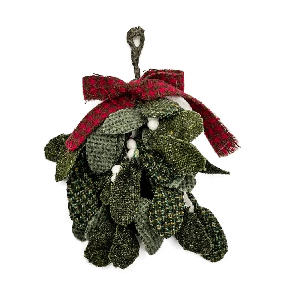 Handmade textile wall hanging of mistletoe with a decorative ribbon.